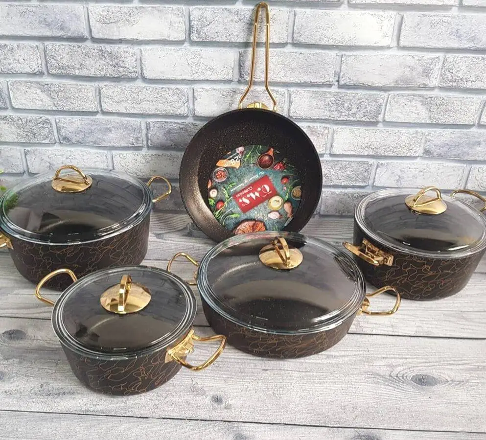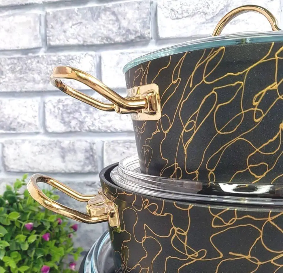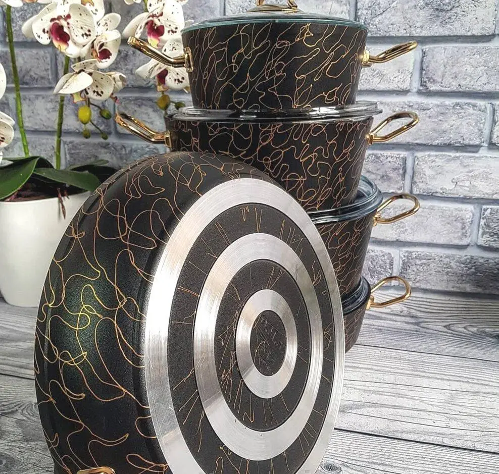 Набір посуду 9 предметів OMS 3037-Gold 20Х10 см / 2,60 л. 24Х12см / 4,30 л. 28Х13 см / 6,95 л. 28Х8 см / 4,2 л СКОВОРОДА 28Х6 см / 3 л