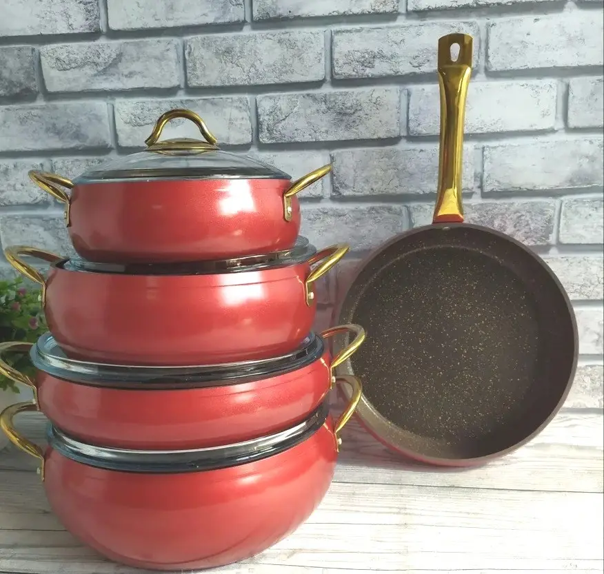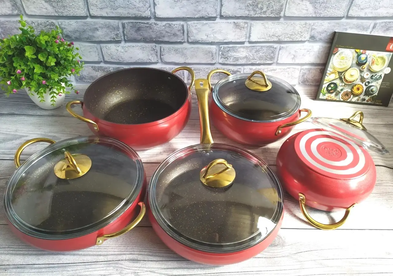 Набір посуду 9 предметів OMS 3040-Red 20Х9 см / 2,50 л. 24Х10,5см / 4,50 л. 28Х11,5 см / 6,6 л. 28Х7 см / 3,5 л СКОВОРОДА 28Х7 см / 3,5 л