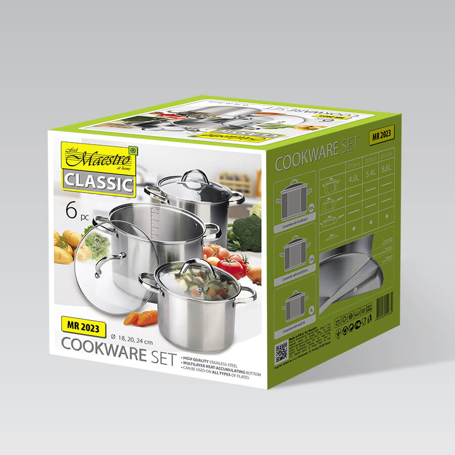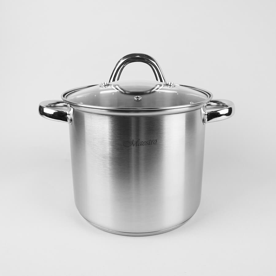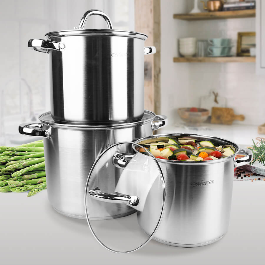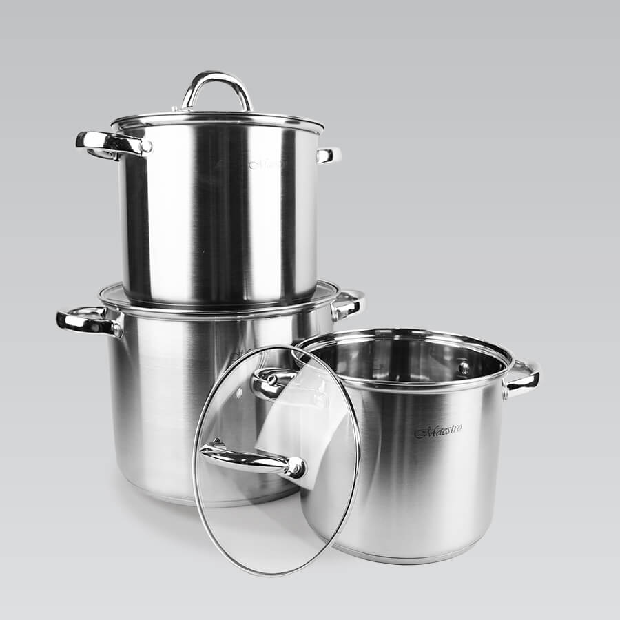Бажаєте купити 3 високі каструлі в одному наборі? Рекомендуємо Maestro MR 2023. Набір посуду Maestro MR 2023 - це набір з 3 каструль з нержавіючої сталі 18/10 зі збільшеною товщиною стінок 0,6 мм. До складу входять дві середні каструлі об'ємом 3,5 і 5 літрів, а також одна велика об'ємом 7,5 літрів. У комплекті з каструлями кришки із термостійкого скла з отворами для виходу пари. Багатошарове теплоакумулююче дно підходить для всіх типів варильних плит та газових поверхонь, включаючи індукцію.