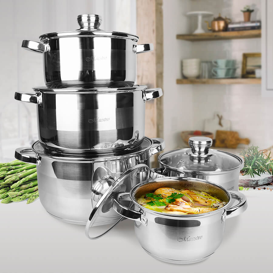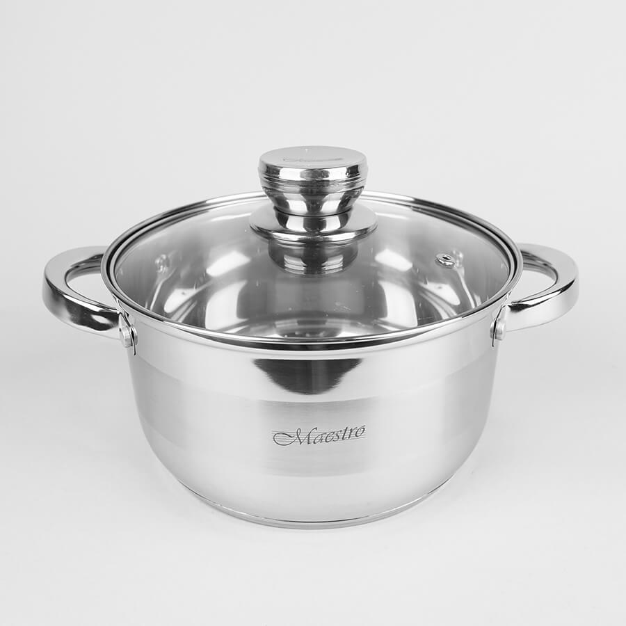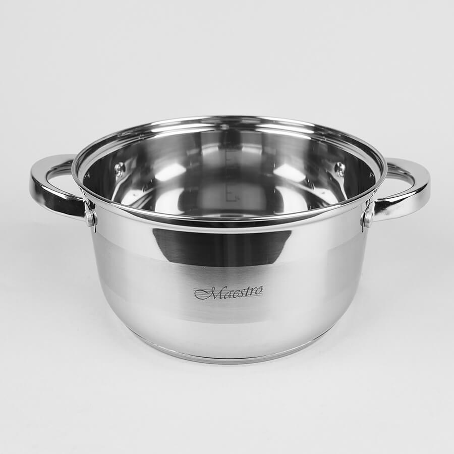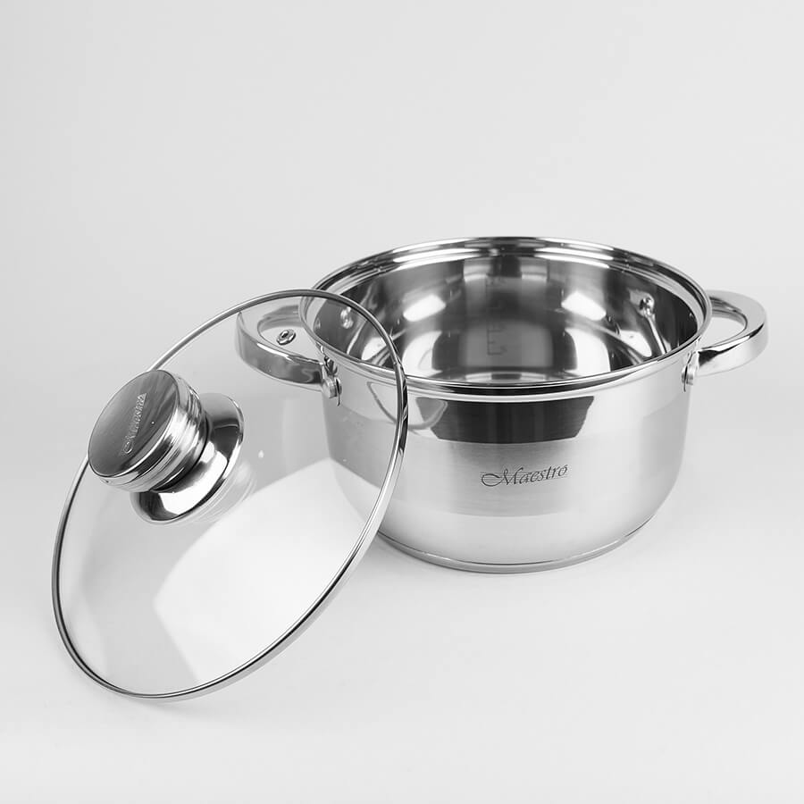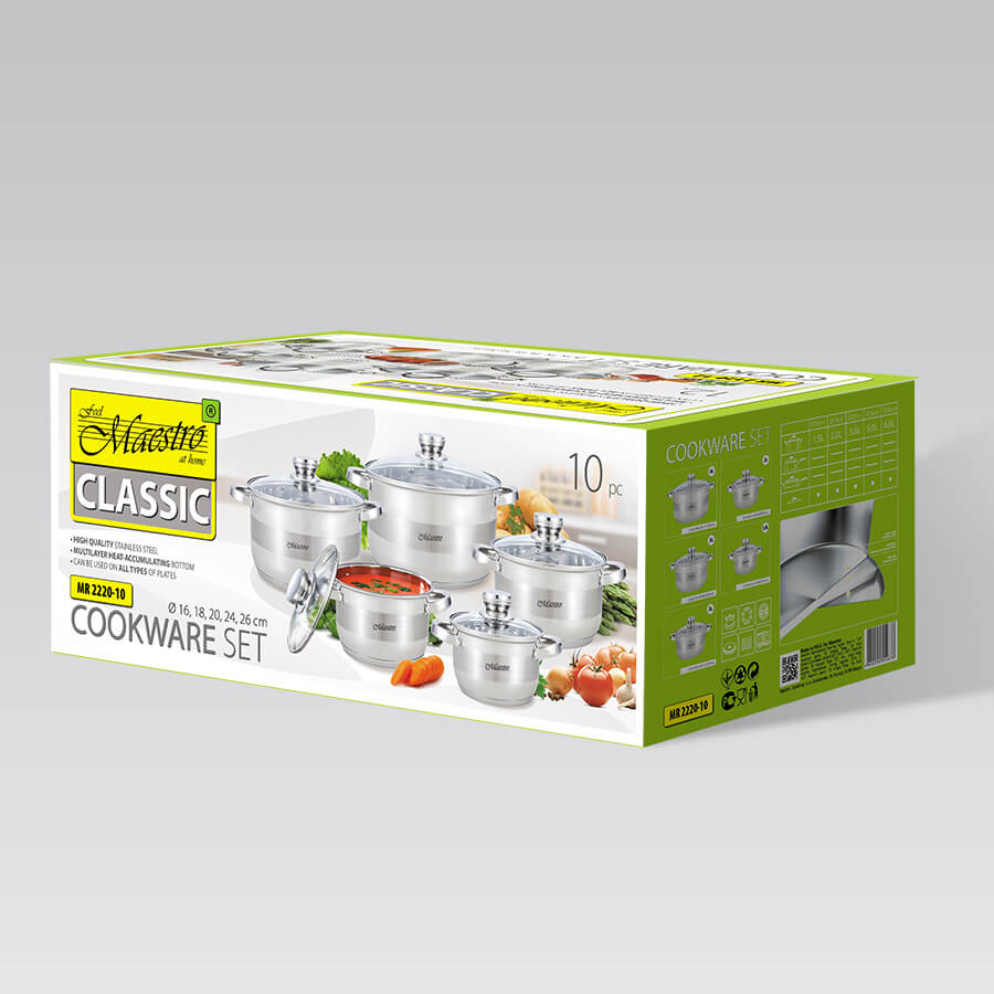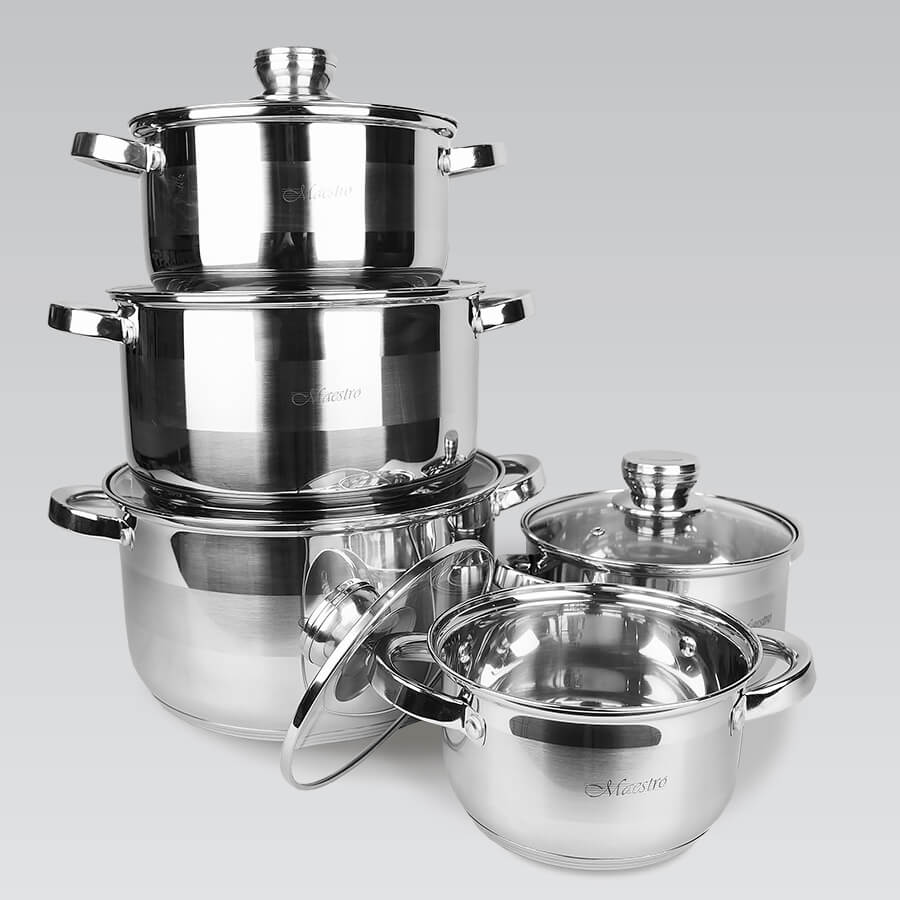 Набір каструль Maestro MR 2220-10 складається тільки з каструль різних діаметрів. Набір входять каструлі об'ємом від 1,5 до 6,0 літрів зі скляними термостійкими кришками з отвором для пари. Каструлі виготовлені із високоякісної нержавіючої сталі 18/10. Ручки каструль та кришок срібного кольору в тон корпусу. Багатошарове термоакумулююче дно підходить для всіх джерел тепла, включаючи індукційні плити та варильні поверхні.