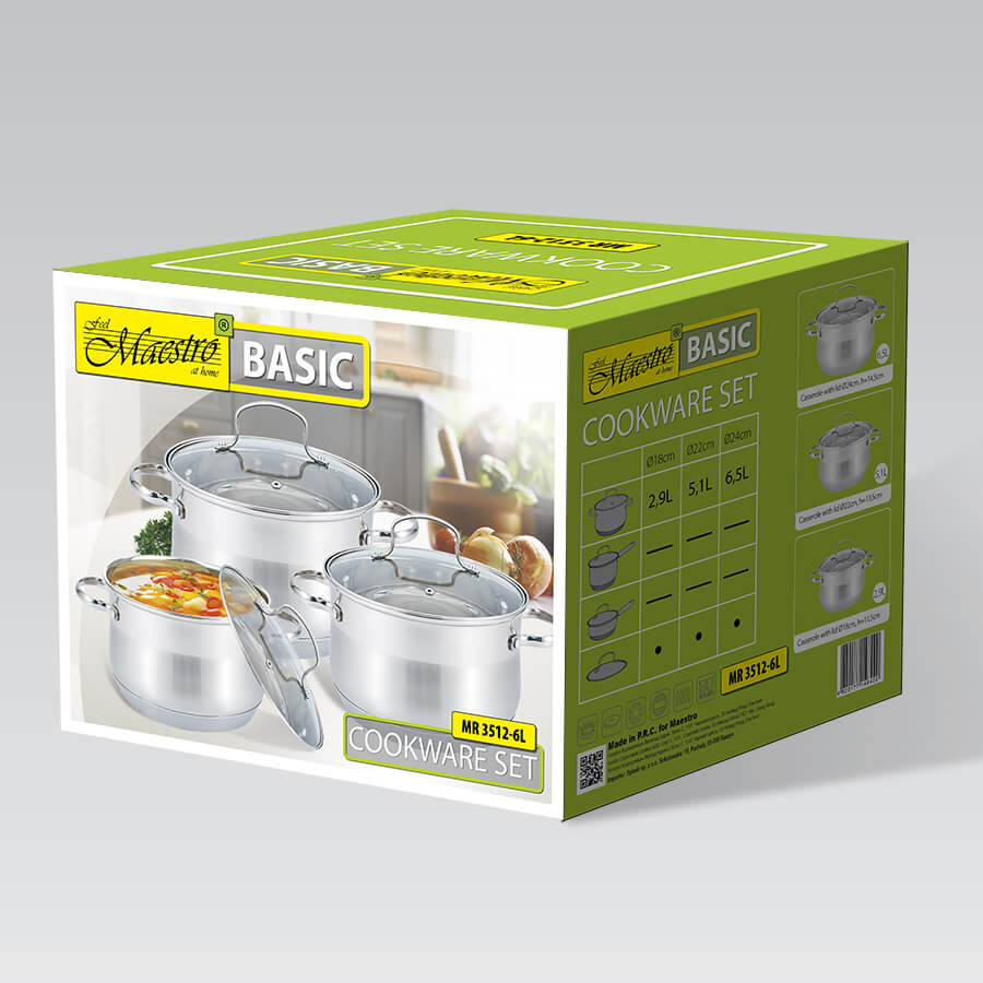 Набір каструль Maestro MR 3512-6L складається з 3х каструль серії Maestro MR 3512, з кришками діаметром: 18, 22, 24 сантиметри, відповідних обсягам каструль 2,9; 5,1; 6,5 літри. Каструлі виготовлені з високоякісної нержавіючої сталі, комбінований матовий корпус з дзеркальною смугою вгорі. На передній стороні нанесено логотип Maestro Basic. Товсте термоакумулююче дно підходить для будь-яких джерел тепла, включаючи індукцію. Кришки з термостійкого скла з отвором для випуску пари та захисним сталевим обідком по периметру.