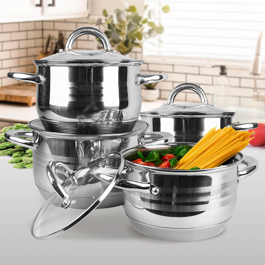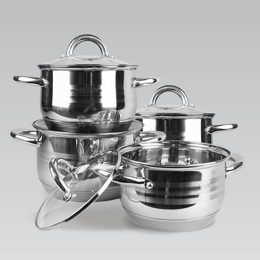 Набір Maestro MR-3513-8 – це 4 каструлі з високоякісної нержавіючої сталі. Вони сумісні з усіма видами плит. Цей набір каструль зручний і простий у використанні та догляді. Завдяки цьому набір каструль Ви зможете із задоволенням готувати ваші улюблені страви. Для очищення каструль можна використовувати посудомийну машину. Набір посуду Maestro (8 предметів) – це набір каструль різного об'єму із кришками.