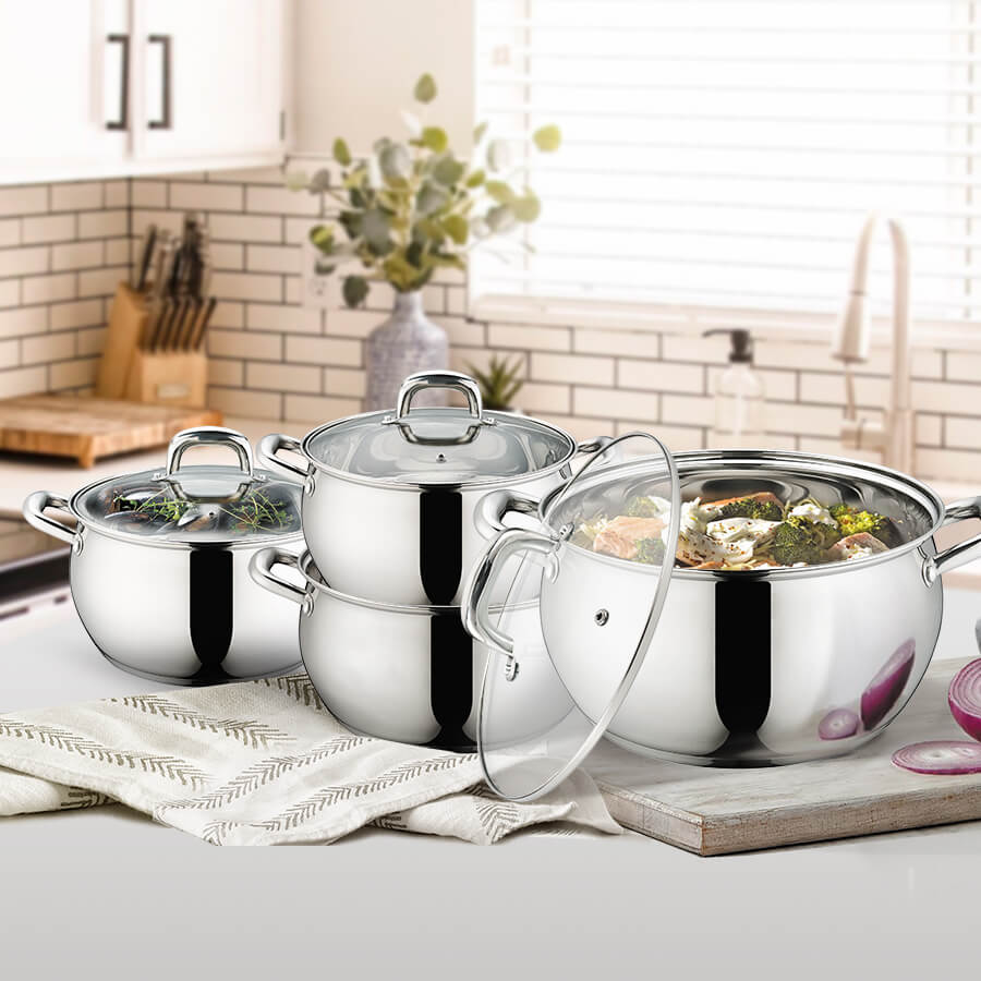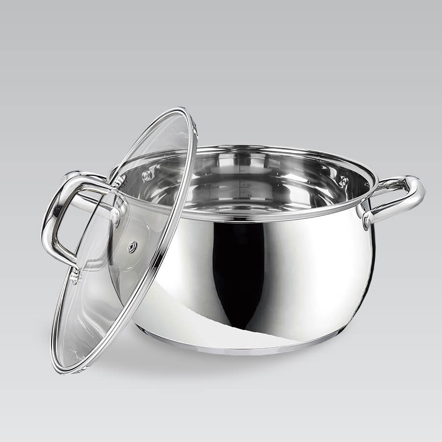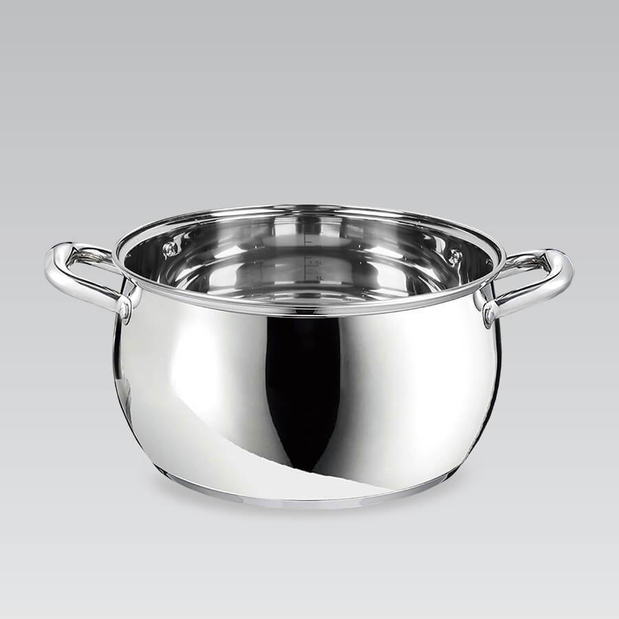 Серія каструль Маестро MR 3515-8. Сучасний дизайн, блискуча полірування та красиві округлі ручки. Виглядає модно, сучасно і в той же час затишно. Завдяки округлому дизайну вміщує більше рідини, ніж аналогічні моделі із прямими стінками. У набір входить 8 предметів, 4 каструлі та 4 кришки до них.