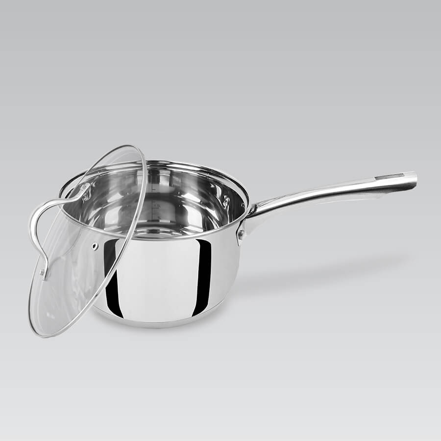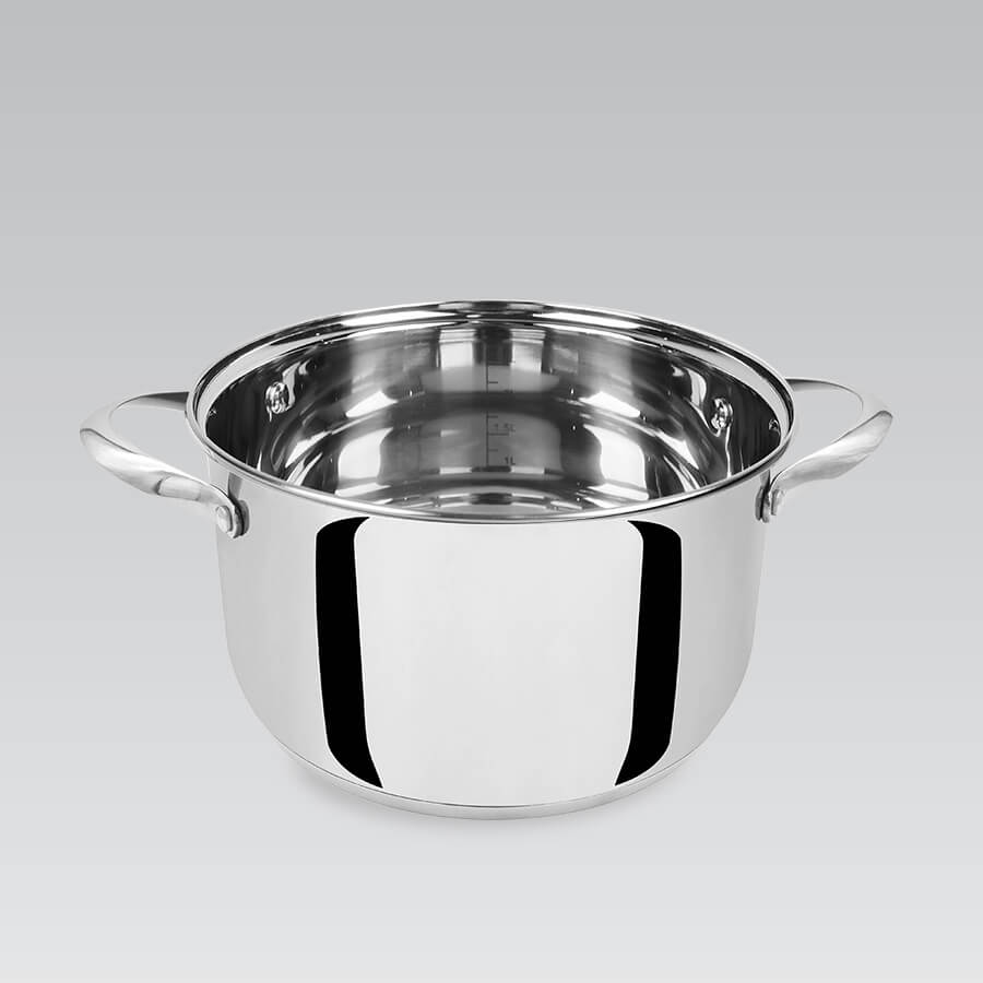 Каструлі виконані в сучасному дизайні. Полірування дзеркальне, каструлька звужена до низу, що надає їй витонченості. Є шкала рівня рідини. Ручки на заклепках.
