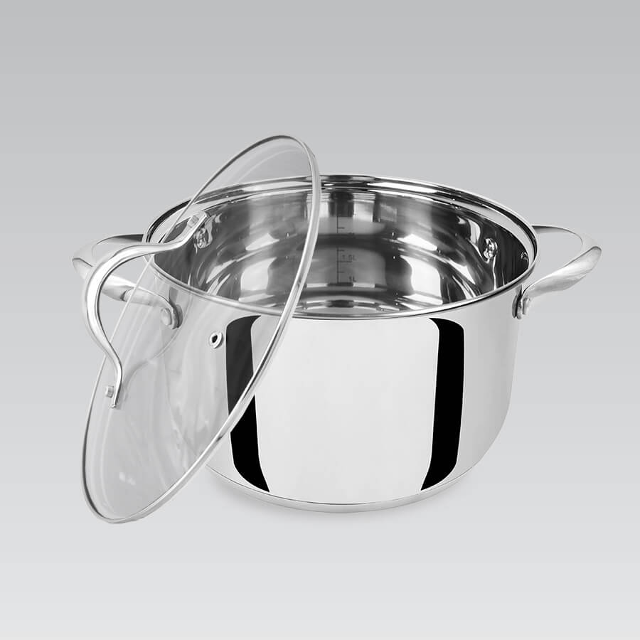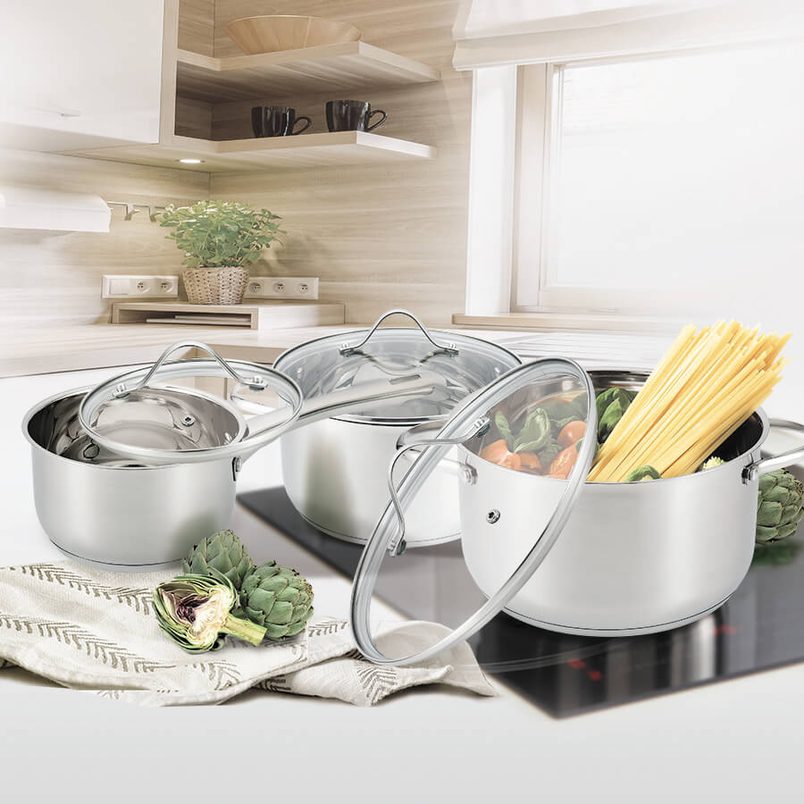 Комплектація: ківш із кришкою Ø 16 см 1,8 л; каструля з кришкою Ø18 см, об'єм 2,5 л; каструля з кришкою Ø20 см, об'єм 3,4 л