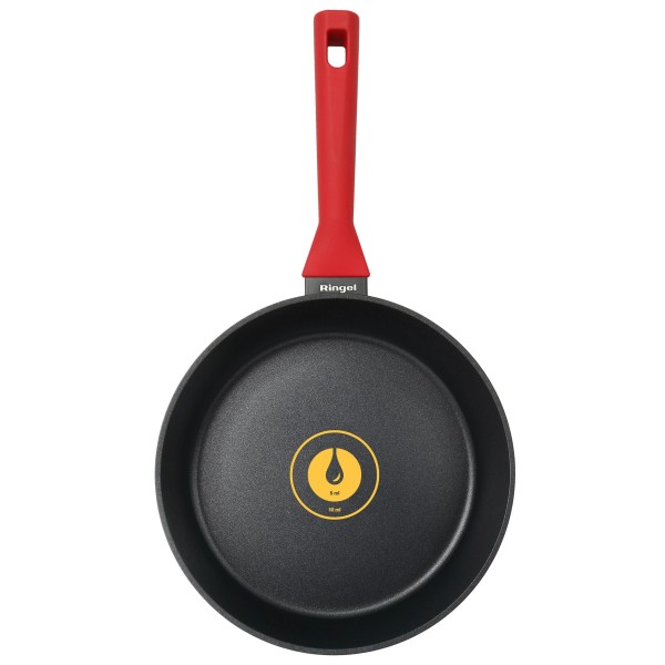У кожну сковороду RINGEL інтегрована перша у світі система дозування олії. Найменша поділка системи відповідає 5 мл олії, а більша – 10 мл олії. За допомогою цієї системи ви зможете легко та швидко приготувати водночас здорові та смачні страви з використання мінімуму жиру та з максимальним збереженням корисних речовин у страві.