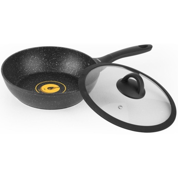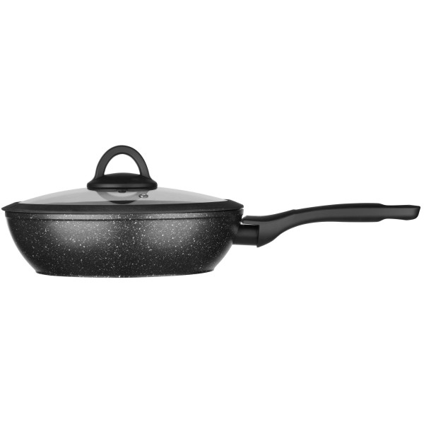Сковорода з кришкою Zira від Ringel - це відмінний варіант як для приготування страв з соусів, самих соусів і тушкування, завдяки високим бортикам, так і прекрасний посуд для розігрівання. Виготовлені з високоякісного кованого алюмінію, дані сковороди є міцним посудом зі швидким і рівномірним нагріванням. Дно сковорідок цієї серії має додаткове потовщення до 3,2 мм.. У даній серії використовується надстійке тришарове антипригарне покриття, що дозволяє використовувати менше олії при приготуванні