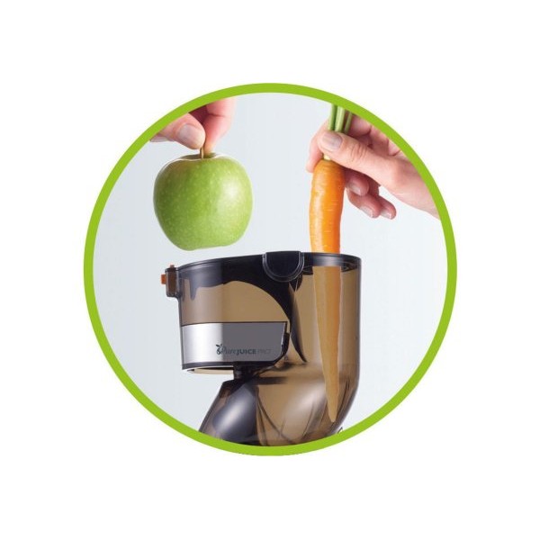 Благодаря двум трубкам, широкой и узкой, ингредиенты не обязательно нарезать, можно помещать их в соковыжималку целиком.