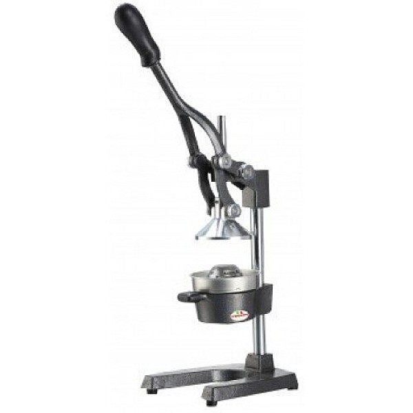Половинка фрукта помещается на конус, опускается прижимной рычаг, и сок извлекается под прессом.