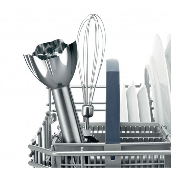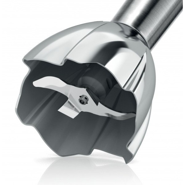 В ножке из нержавеющей стали QuattroBlade Pro установлен 4-лопастной нож, благодаря ему возможно быстро и эффективно измельчить и смешивать ингредиенты, не допуская разбрызгивания жидких фракций.