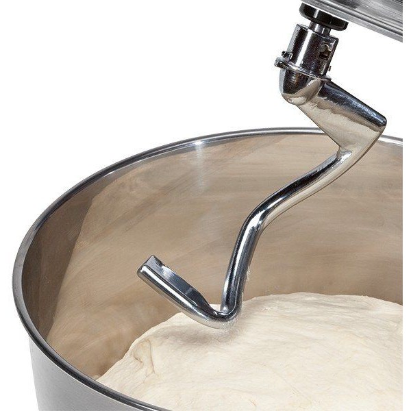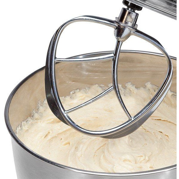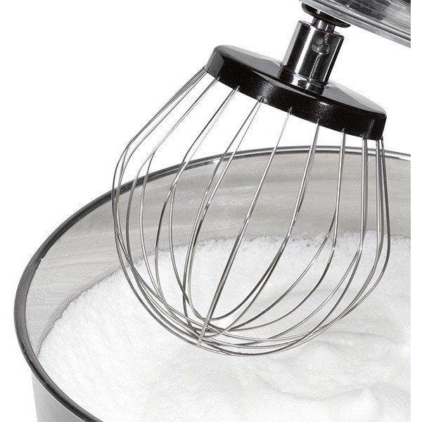 Чаша из нержавеющей стали емкостью 6,5 л для приготовления макс. 3-3,5 кг теста. Откидная универсальная консоль с отпирающим механизмом. Прозрачная защита от брызг с отверстием для заполнения (съемная). Предохранительный выключатель - производит выключение при откидывании консоли вверх. Литой алюминиевый крюк для перемешивания плотного теста, например дрожжевого, макаронного теста или теста для хлеба. Литой алюминиевый крюк перемешивания для легкого теста, например песочного, слоеного или бисквитного. Венчик из нержавеющей стали для взбивания яичных белков, крема, меренг и многого другого.