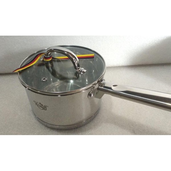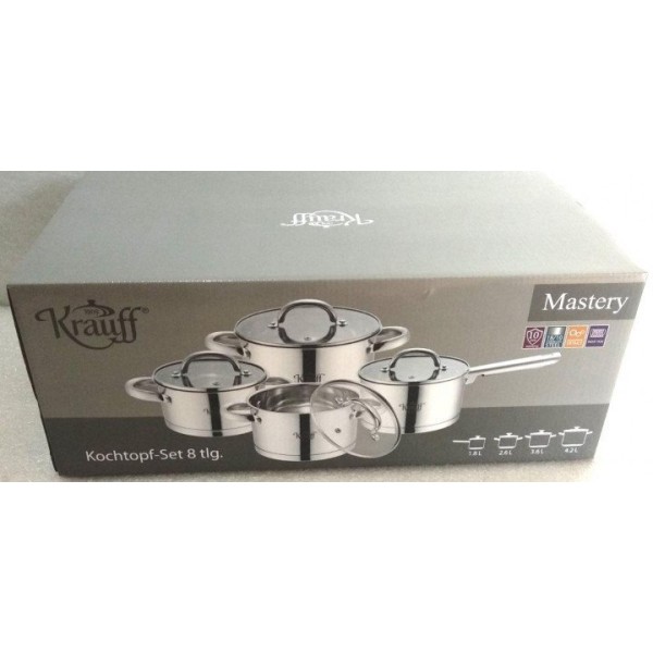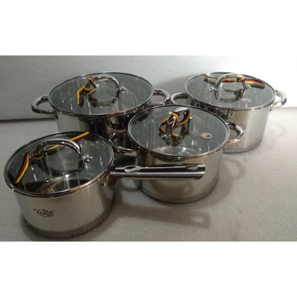 Набор посуды Krauff 26-242-044 в него входит восемь предметов, из них три кастрюли, ковш, а остальные четыре — крышки для них.