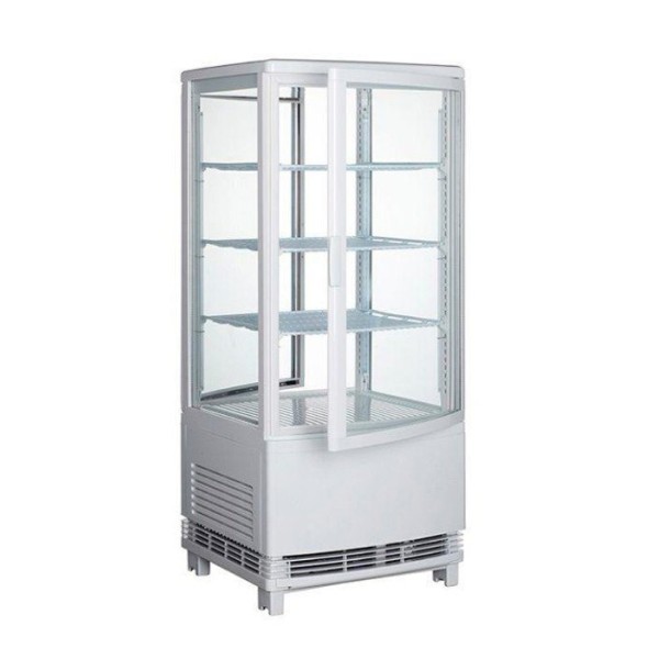 Агрегат виконаний з білого пластику і оснащений склом з чотирьох сторін і двома вигнутими дверима, має три полиці і підсвічування з двох сторін, об'єм 86 літри, авто відтайка.