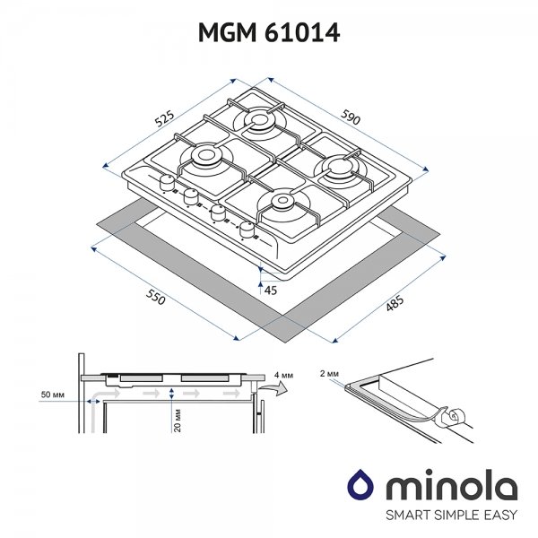 Удобство использования Minola MGM 61014 имеет 4 газовые конфорки, мощность которых регулируется поворотными ручками.