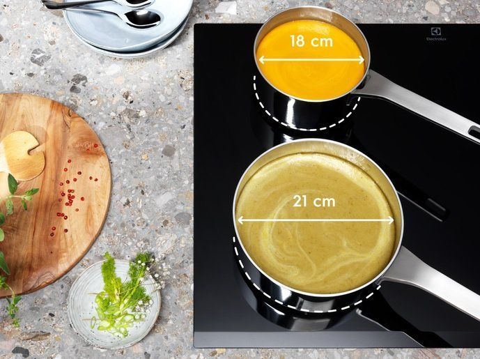 Індукційна варильна поверхня 600 Bridge дозволяє поєднувати дві окремі зони готування для створення однієї великої конфорки. Завдяки автоматичному вирівнюванню налаштувань температури й часу, вона ідеально підходить для багатьох планча-грилів та каструль для запікання. Творіть кулінарні шедеври без обмежень. Індукційні варильні поверхні Infinite підлаштовуються під ваші потреби. Розмір конфорок змінюється автоматично відповідно до розміру та форми дна посуду, забезпечуючи рівномірне нагрівання усієї поверхні.