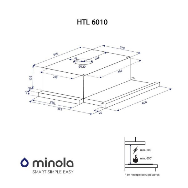 Телескопическая вытяжка Minola HTL 6010 FULL INOX 430 – как раз идеальный вариант, ведь обладает встраиваемой (в шкаф) конструкцией.