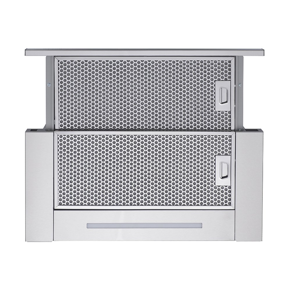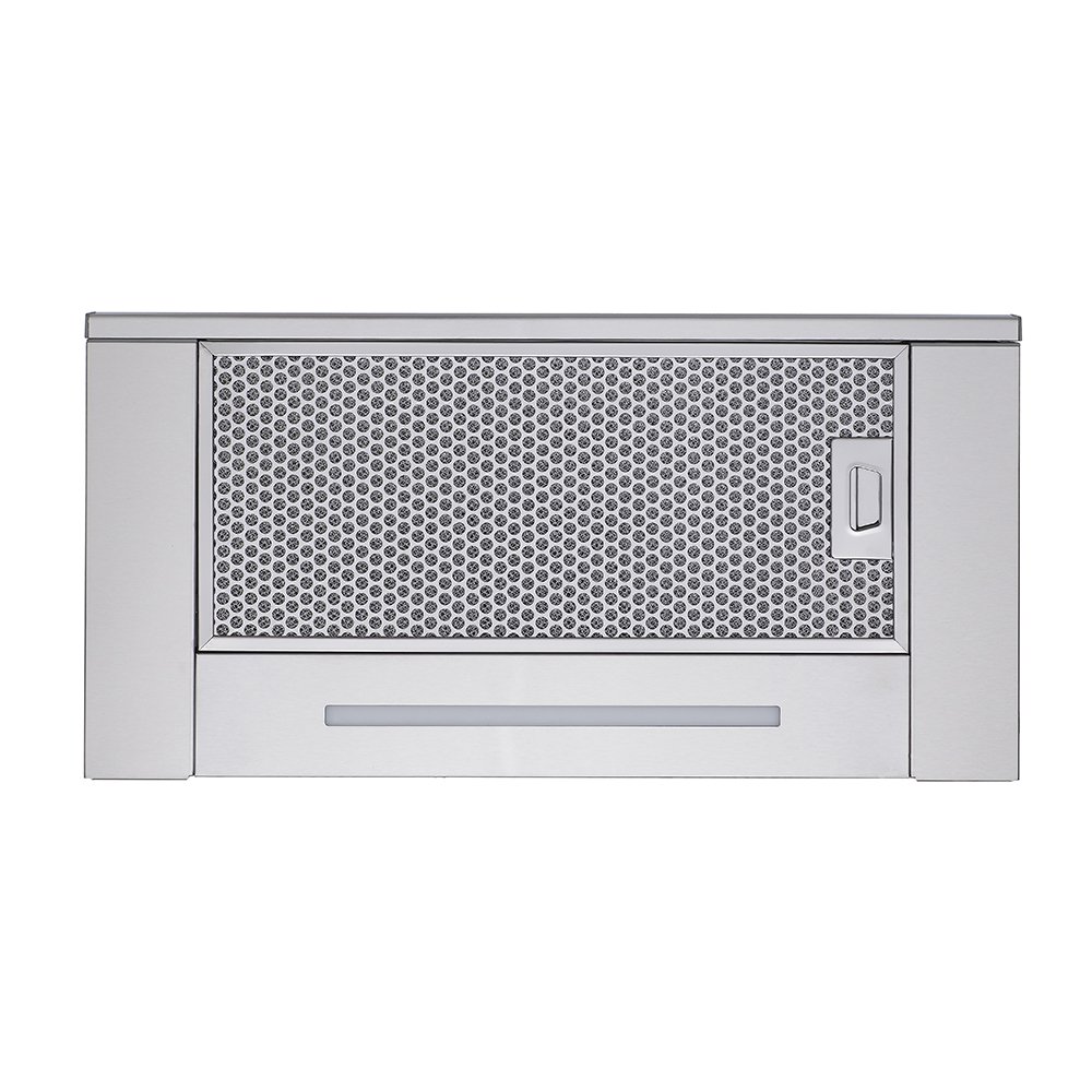 Практически весь корпус телескопической вытяжки спрятан внутри навесного модуля и эта максимально узкая полоса панели будет практически незаметна.